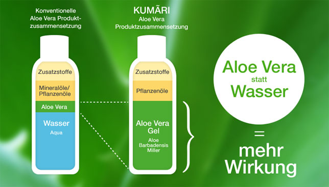 Bei allen KUMÃRI-Hautpflegeprodukten wird anstelle von Wasser reines Aloe Vera Frischpflanzen-Gel verwendet. Das unterscheidet KUMÃRI von handelsüblichen Produkten und erklärt die hohe Wirksamkeit der KUMÃRI Naturkosmetik.